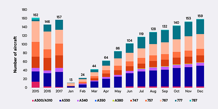The current stored volume of aircraft (c.400) is critical as these aircraft provide a swift supply to fulfil short term or unplanned operator demand requirements; and given that a typical transition period is around 12 months, these stored aircraft are key to achieving 2019 volumes. 2019 will also likely see small volumes of other widebody aircraft types start to transition from first operators into the secondary market. Macroeconomic uncertainty may impact on transitions volumes as operators review their capacity and fleet plans. The industry is starting to comment that the market cycle has likely peaked, and is flattening off, with some mooting entering of a very gradual downturn, potentially driven by the current cost of fuel (oil price) that has risen steadily throughout 2018. This is balanced with the continued growth in both passenger and freight traffic, although the slowdown in the Chinese economy may place further pressure on airline operators to ensure they have a balanced fleet profile and capacity.