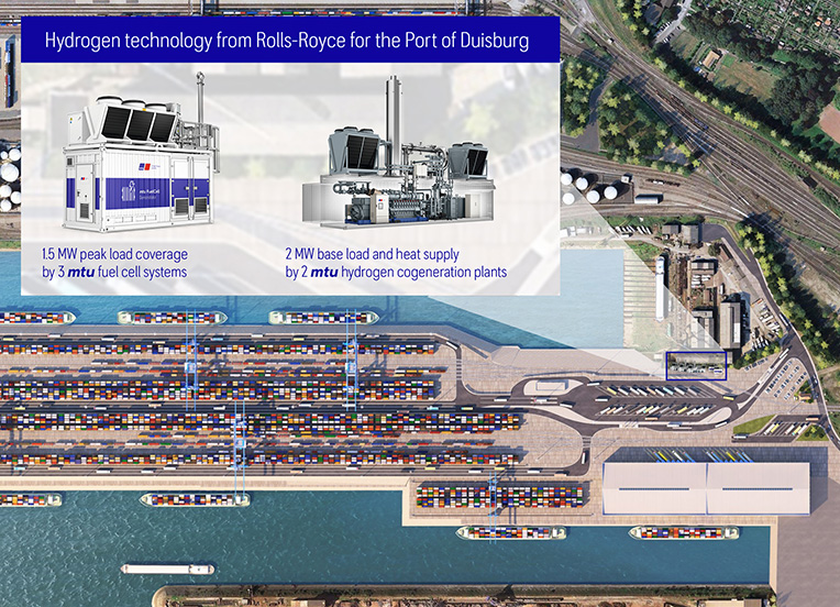 As one of the fuels of the future and as an essential building block for the energy transition, hydrogen will play a central role when, in a few years' time, Duisburg, Europe's largest inland port, shows what the energy supply of the future may look like: decentralised and climate-friendly. The largest container terminal in Europe's hinterland is currently being built on the former coal island, once a trans shipment point for bulk cargo. It will not only set new standards in cargo handling, but also in climate-friendly energy supply. The main role in this project, called "enerport II", is played by fuel cells and mtu hydrogen engines - each with different tasks.