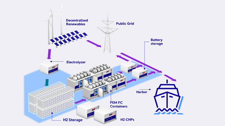 The hydrogen-powered mtu fuel cell solutions supply electrical power as soon as the public power grid reaches its limits, for example for the on-board power supply of ships berthed in the port or in the event of other load peaks.