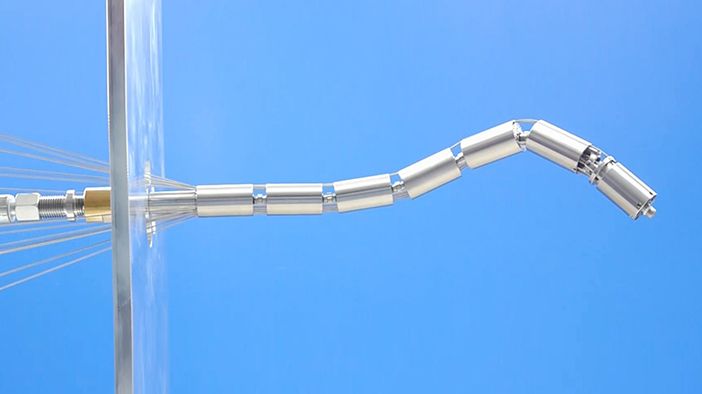 Created with the support of the Fraunhofer Institute, the miniaturized and flexible probe is inserted directly into the engine through fuel injector entrances and is precisely directed to the turbine blade. A special cleaning head delivers a water jet at a pressure of up to 500 bar - approximately four times the pressure of a conventional high-pressure cleaner - onto the turbine blades while precisely maintaining the selected position. Up to 360 air cooling holes can be cleaned at the same time.