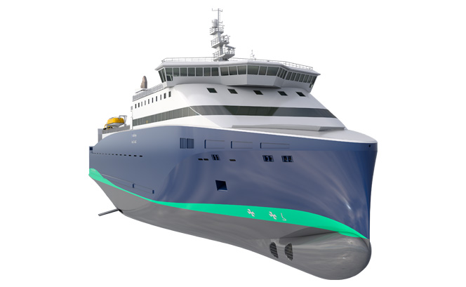 NVC 253 LNG is optimised for efficient RO-RO cargo handling with 3,3000 TDW and designed for excellent comfort for passengers and crew. This gas-fuelled RO-PAX design makes for efficient year-round North Sea operation with a service speed of 19KN. The vessel ensures optimal performance thanks to its design and the integrated system solution maximising efficiency across all on-board systems. The integrated system solution selected for this vessel ensures optimal performance together with the design. The vessel can accommodate up to 400 passengers and has a 1,800 NM endurance without refilling.